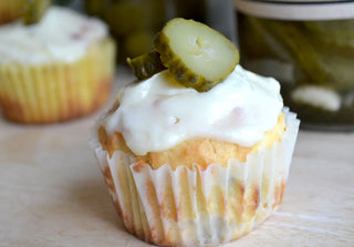 Spread frosting on cooled cupcakes, garnish each with a pickle.